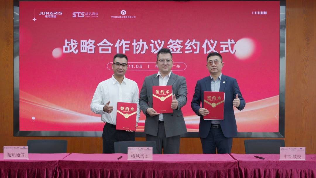 2025年11月3日,峻域集团、中经城投建设集团(以下简称“中经城投”)与超讯通信在广州举行“桂林华峻AI产业园”项目战略合作签约仪式,标志着三方正式确立深度战略伙伴关系,未来将聚焦算力+新能源领域协同合作,共启产业融合发展新局。