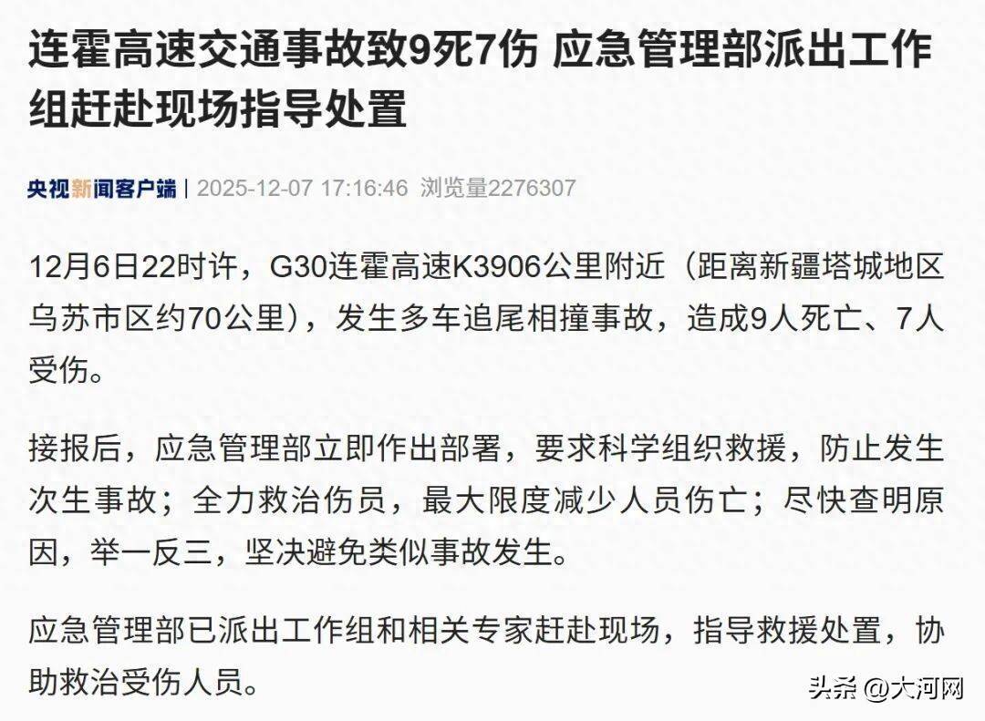 12月6日22时许,G30连霍高速K3906公里附近(距离新疆塔城地区乌苏市区约70公里),发生多车追尾相撞事故,造成9人死亡、7人受伤。