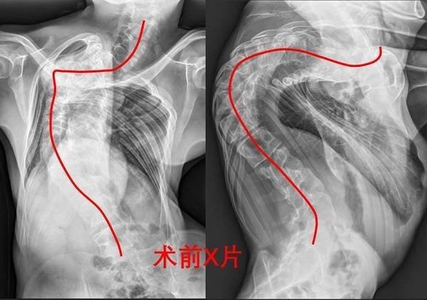 术前X片显示,患者脊柱形态(红线处)严重侧弯。重医附二院供图